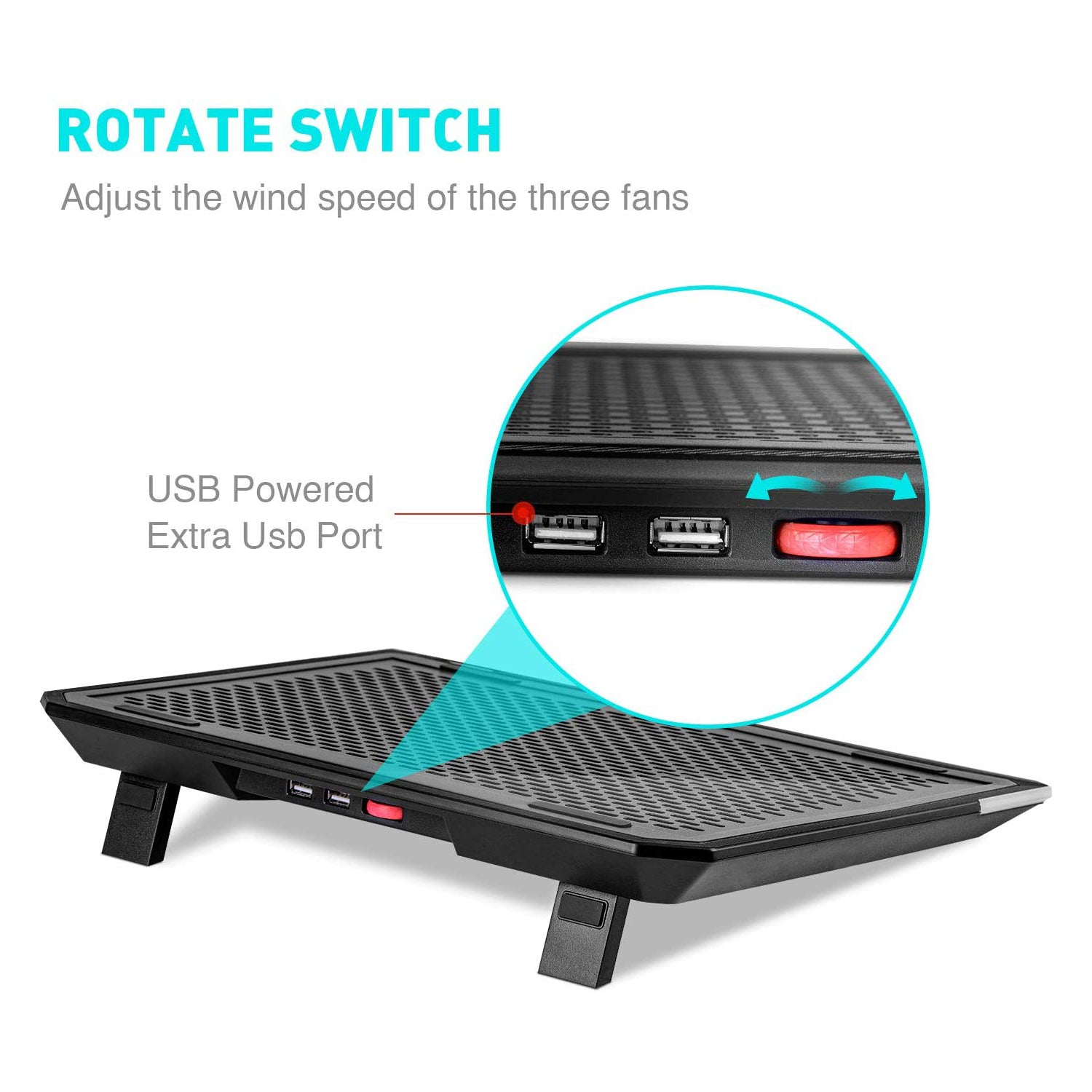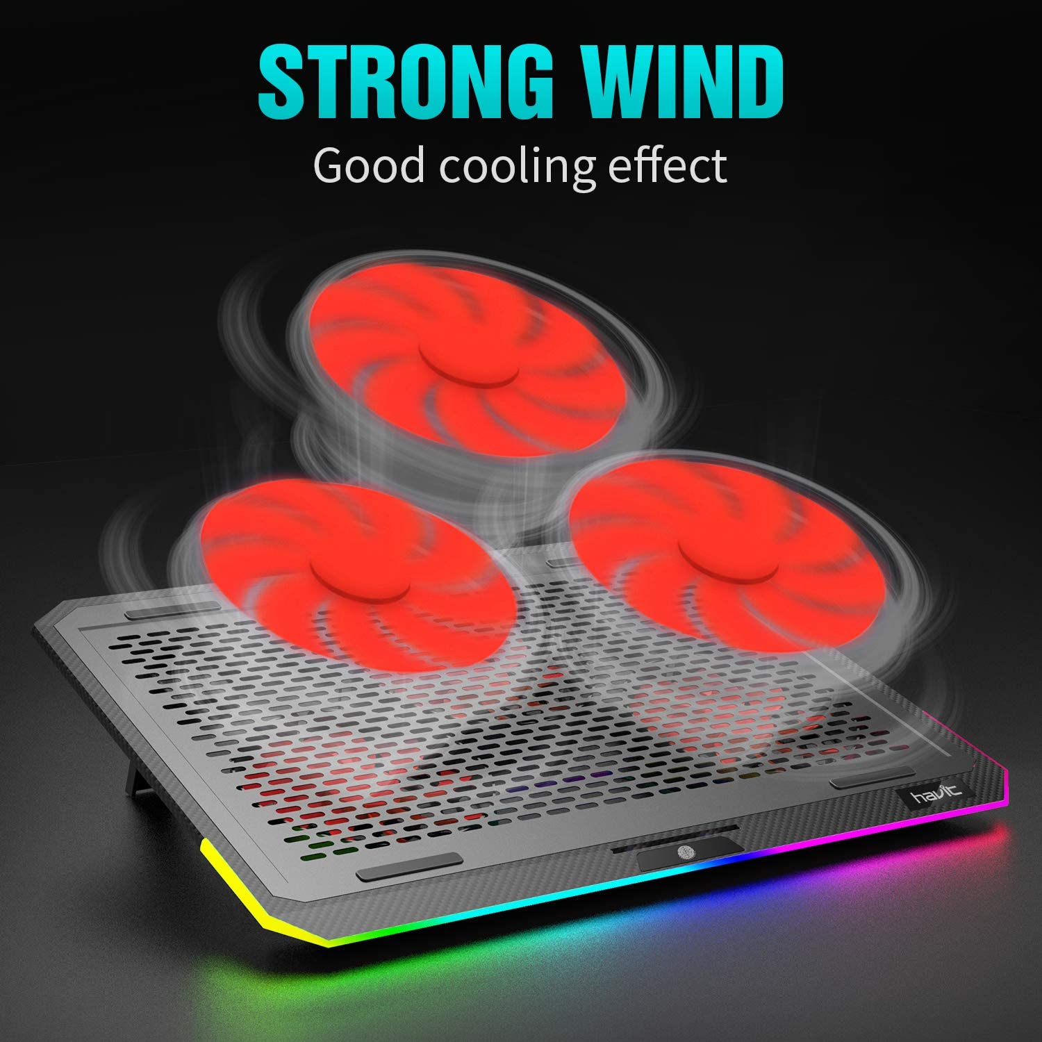 Drehbarer Schalter zum Einstellen der Windgeschwindigkeit von vier Lüftern. Auffälliges blaues LED-Licht, um den Windgeschwindigkeitsstatus der Lüfter besser zu erkennen. (Je heller das Licht ist, desto schneller ist die Geschwindigkeit). Das HAVIT F2073 Gaming Laptop Cooling Pad mit 15 Arten von RGB-Seitenlicht, eine Taste zum Umschalten, schaffen eine coole Atmosphäre, perfekt zum Spielen und Arbeiten.