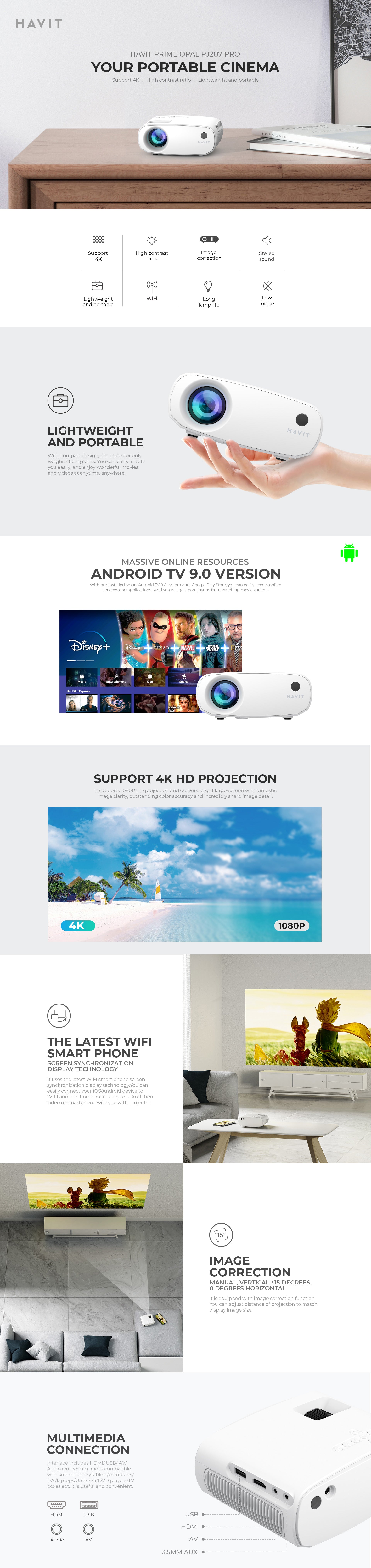 It supports 1080P HD projection and delivers bright large-screen with fantastic image clarity, outstanding color accuracy and incredibly sharpimage detail